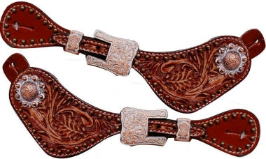 Ladies Floral Tooled Spur Straps with Engraved Copper Buckles