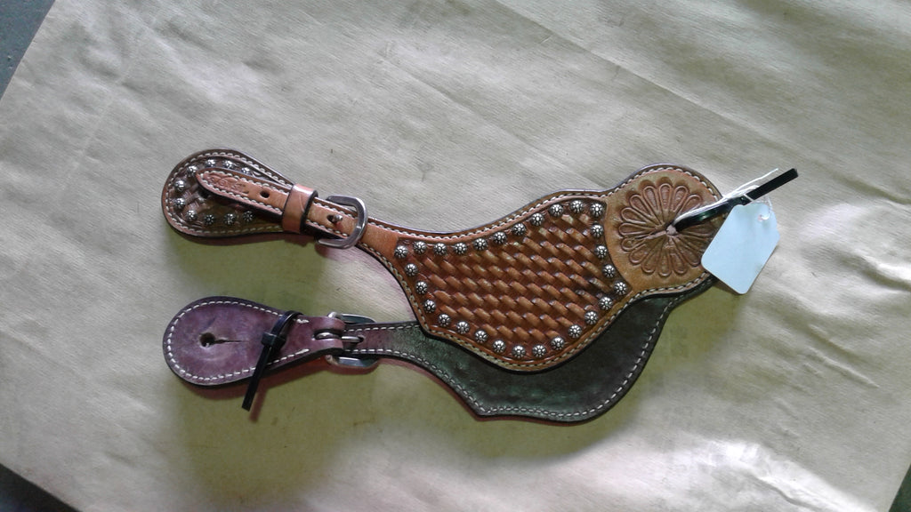 Lovely tan basket weave embossed leather spur straps. Silver studs border the outside of the mid section. Floral detail at each end of strap. Nice enough to show in.